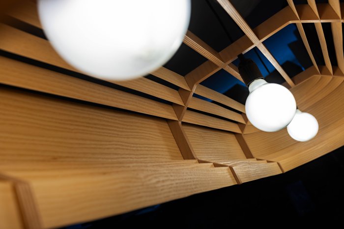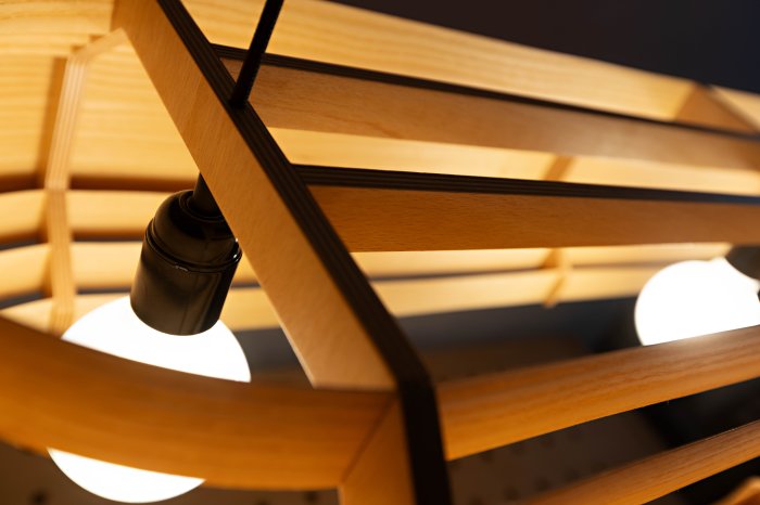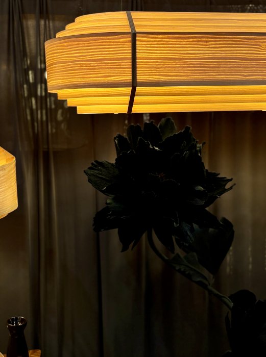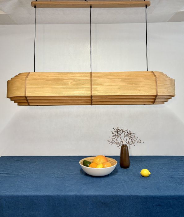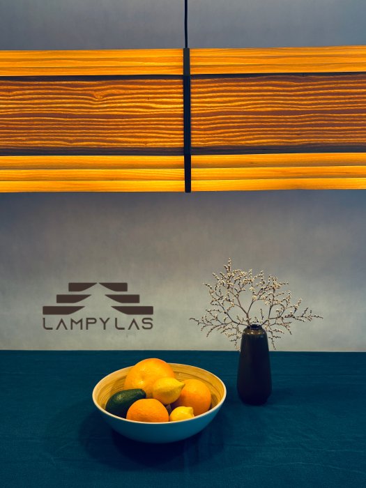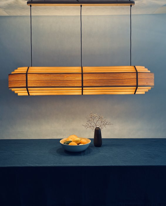 Zaprojektowana z myślą o oświetleniu długich stołów, lampa AURORA LONG wyposażona jest w trzy źródła światła, które doskonale iluminują powierzchnię stołu oraz przestrzeń nad nim. Światło przenika przez subtelne pasy forniru, wypełniając pomieszczenie ciepłym, bursztynowym blaskiem, który nadaje wnętrzu wyjątkowej atmosfery.