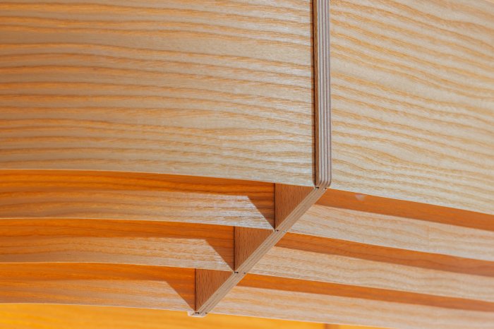 Lampa wykonana jest z naturalnego drewna (sklejka bukowa lub jesion), co nadaje jej autentyczności i szlachetności. Z czasem barwa drewna może ulegać delikatnym zmianom, co jest naturalną cechą materiału. Aby zachować jej piękno, należy chronić lampę przed zmianami wilgotności oraz bezpośrednim działaniem promieni słonecznych.